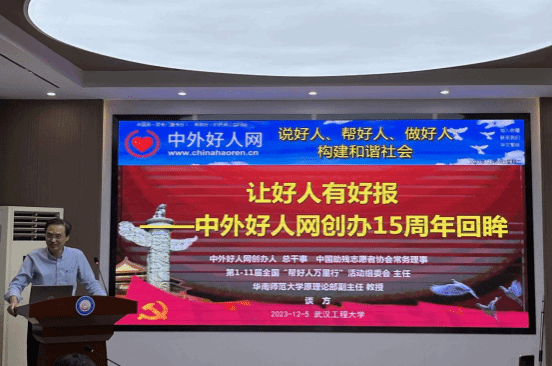 (通讯员:熊雪璟 张悦)12月5日晚,,,,,,,中外好人网武汉办事处授牌聘用仪式暨大型思政选修课《加油中国》第五季第七讲在抖圈·(中国)人生就是搏!求是楼112报告厅举行。。。。。“中外好人网”开办人、华南师范大学谈方教授受邀主讲,,,,,,,以“让好人有好报—中外好人网开办15周年回眸”为主题,,,,,,,从什么是“中外好人网”、为什么要开办中外好人网以及中外好人网15年的生长历程和效果三个方面为各人做了详细阐释,,,,,,,本次运动由抖圈·(中国)人生就是搏!副院长常城教授主持。。。。。