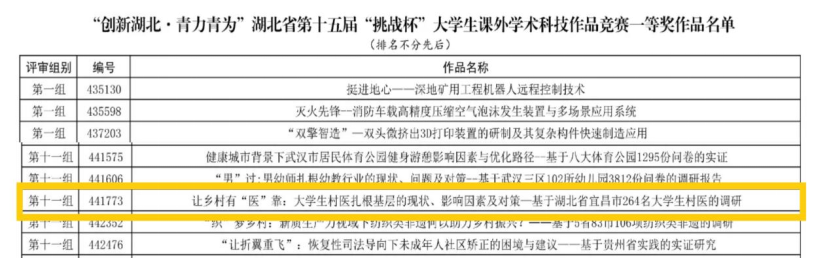 (通讯员:徐嘉婧 张思雨)5月25日,,,,,湖北省第十五届“挑战杯”大学生课外学术科技作品竞赛在湖北大学圆满收官。。。。。。。。我院一支由8名学生组成的团队依附《让墟落有“医”靠:大学生村医扎基本层的现状、影响因素及对策——基于湖北省宜昌市264名大学生村医的调研》项目,,,,,从全省122所高校1771件作品中脱颖而出,,,,,最终荣获一等奖,,,,,实现了我院在该项赛事省级奖项的重大突破!
