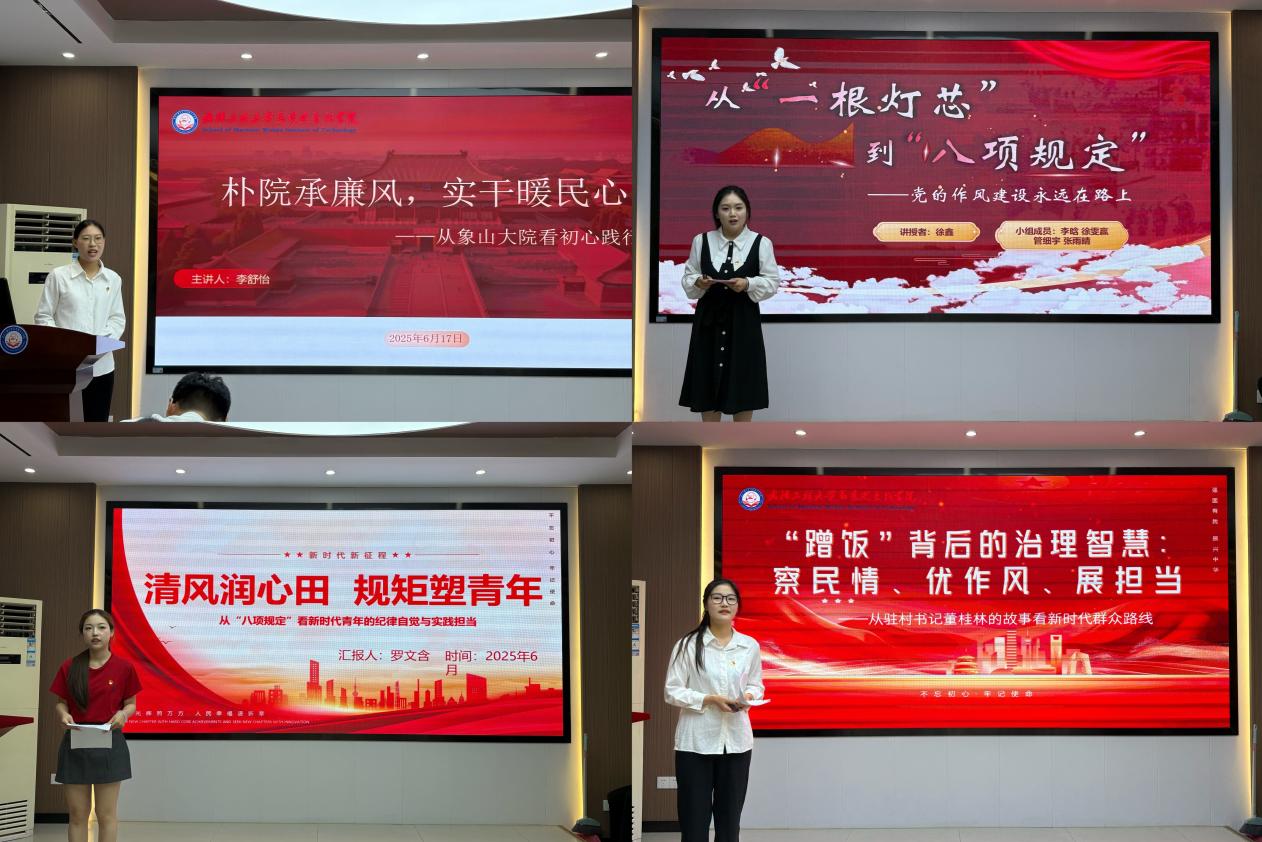 通过讲述浙江象山县政府大院的简朴外观,,,,,,,,李舒怡展现了其艰辛斗争、实干兴邦的精神风貌。。。。。。。。徐鑫讲述了从井冈山时期 “一根灯炷” 的艰辛斗争到新时代 “八项划定”,,,,,,,,强调作风建设永远在路上。。。。。。。。罗文含解说了中央八项划定精神,,,,,,,,强调新时代青年要践行中央八项划定精神,,,,,,,,强化纪律自觉与责任继续。。。。。。。。常晓莹通过讲述河南驻村书记董桂林“蹭饭”的故事,,,,,,,,强调新时代下层干部应践行群众蹊径。。。。。。。。