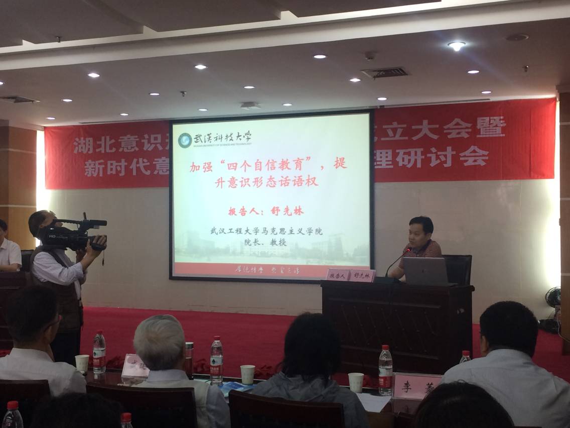 我院舒先林教授在大会上受聘为湖北意识形态建设研究院咨询专家,,,,,,,并作了题为《增强“四个自信”教育,,,,,,,提升意识形态话语权》的专题报告。。。。。。。报告以为:思政课西席是高校意识形态建设的主力军,,,,,,,在教育教学历程中,,,,,,,一定要树立责恣意识、阵地意识和问题意识;;;;;;高校主流意识形态内在建设应围绕“四个自信”睁开,,,,,,,思政课教育教学必需增强盛学生对“四个自信”的明确和认同;;;;;;“四个自信”背后的逻辑现实上是“价值自信”,,,,,,,要通过增强“四个自信”教育推进马克思主义中国化时代化公共化,,,,,,,提升国际话语权。。。。。。。
