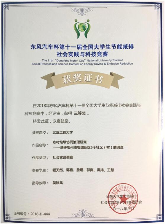 8月7日至9日,,,,,“春风汽车杯”第十一届天下大学生节能减排社会实践与科技竞赛决赛在武汉理工大学举行。。。。。。本届节能减排竞赛吸引了清华大学等418所高校的3881件学生作品参赛,,,,,参赛人数首次凌驾20000人。。。。。。我院社会实践团队撰写完成的社会实践视察作品《农村垃圾协同治理研究——基于鄂州市鄂城新区5个社区(村)的视察》荣获本次大赛三等奖。。。。。。