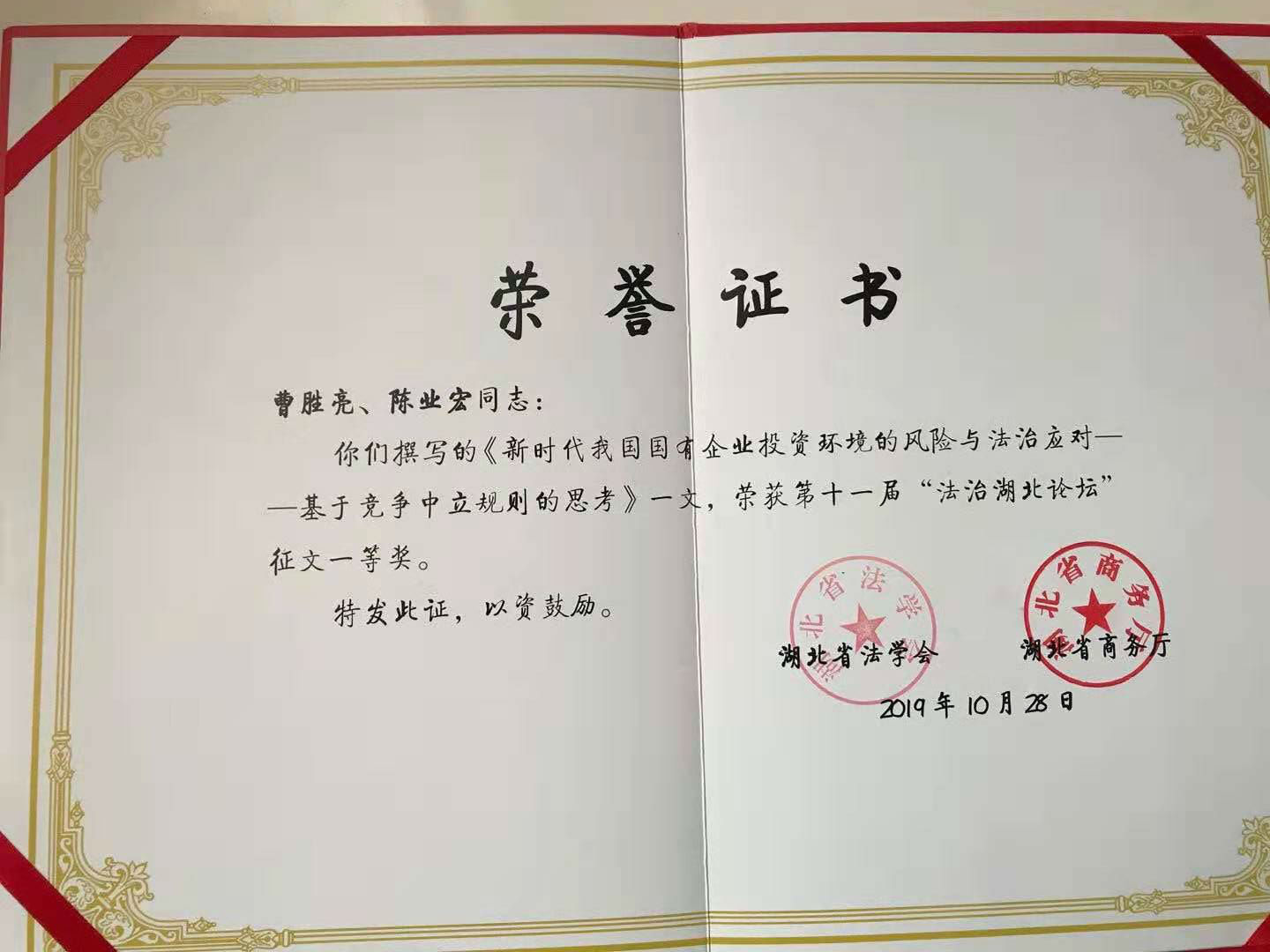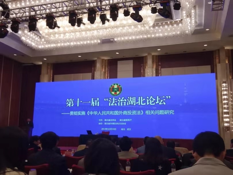 2019年10月30日,,,,,,第十一届“法治湖北论坛”在武汉市洪山宾馆举行。。。。。。。本届论坛由湖北省法学会、湖北省商务厅主理,,,,,,湖北省外商投资企业协会协办。。。。。。。湖北省法学会会长傅德辉主持论坛主旨报告会,,,,,,湖北省副省长杨云彦出席论坛并揭晓主要讲话,,,,,,商务部外资司副司长叶威作了题为“《外商投资法》的立法配景与外商投资的法治包管”的主旨演讲。。。。。。。省委政法委副书记、省法学会党组书记、常务副会长刘太平出席论坛并主持了论坛总结。。。。。。。我院院长曹胜亮教授应邀出席论坛并作主题讲话。。。。。。。