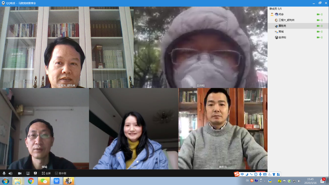 (通讯员:常城)2020年3月16日下昼,,,,,抖圈·(中国)人生就是搏!向导班子召开了2020春学季党政联系视频专题聚会,,,,,聚会由抖圈·(中国)人生就是搏!院长曹胜亮教授主持,,,,,院党委书记舒先林教授、副院长金诗灿和常城,,,,,办公室主任刘会加入了此次聚会。。。。。