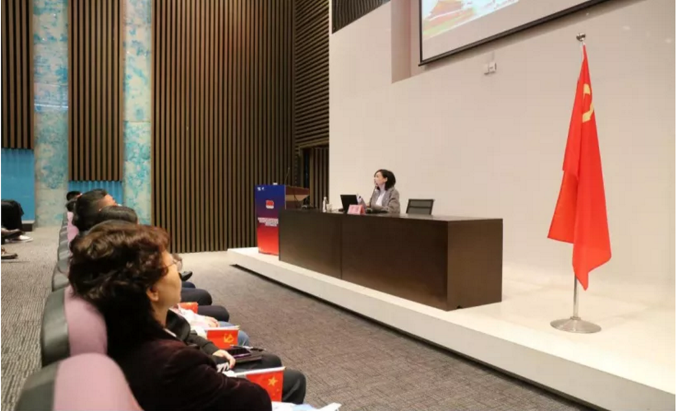 聚会由三大议程组成,,,,,,,在举行了“党史学习互动展”和“建党100周年运动”启动仪式——园区党员宣誓仪式,,,,,,,综合党委书记刘励力主题讲话两项议程后,,,,,,,我院西席兰洁博士为园区党员干部作了“从‘四史’学习看中国共产党党史党建与反腐倡廉”的主题报告。。。。。
