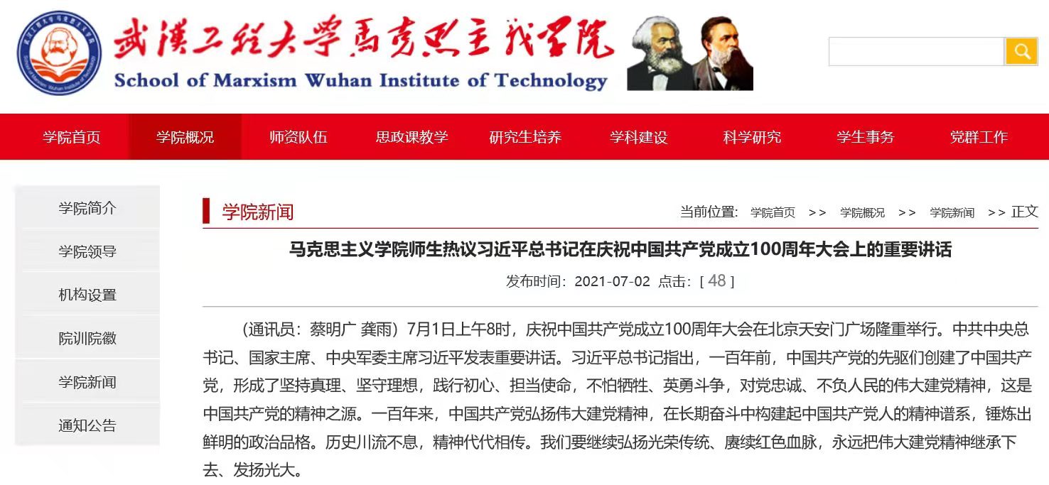 学院举行了形式多样的学习分享会。。。。。。。。院长曹胜亮第一时间撰写了题为“斗争百年路 启航新征程”的学习心得,,,,,,,,从“党的绚烂历史照亮未来”“党的基础宗旨始终切记”“伟大建党精神特出千秋”等三个方面分享体会,,,,,,,,泛论感想。。。。。。。。他指出,,,,,,,,宽大党员干部要时刻不忘党的基础宗旨,,,,,,,,以为民务实清廉的现实验动为伟大的为人民服务事业斗争终生。。。。。。。。7月2日,,,,,,,,湖北高校思政网对我省教育系统学习习近平总书记讲话精神的总体情形作了集中报道,,,,,,,,曹院长的学习体会被收入其中。。。。。。。。