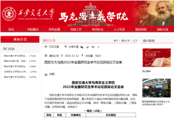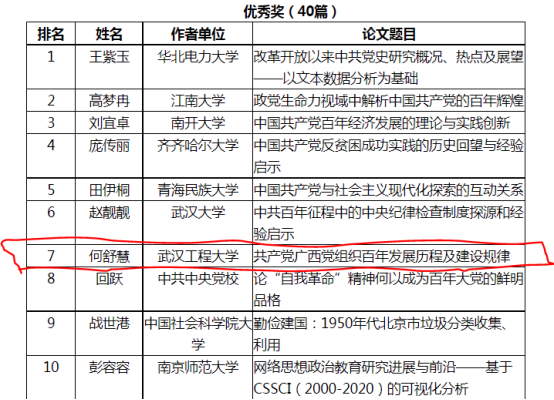 (通讯员蔡明广)克日,,,,,,我院2020级硕士研究生何舒慧(导师为何景春教授)撰写的论文《共产党广西党组织百年生长历程及建设纪律》在西安交通大学抖圈·(中国)人生就是搏!2021年天下研究生学术论坛获得优异奖。。。。。。。。据悉,,,,,,本次论坛共收到包括中共中央党校、清华大学、武汉大学、南京大学、中国人民大学、南开大学、吉林大学、兰州大学、华南师范大学、陕西师范大学、西南大学在内208所高校(81个单位具有马克思主义理论学科博士点)研究生提交的论文803篇。。。。。。。。经主理方组织专家评审,,,,,,共评选出获奖论文100篇,,,,,,其中一等奖10篇,,,,,,二等奖20篇,,,,,,三等奖30篇,,,,,,优异奖40篇。。。。。。。。何舒慧同砚提交的论文获得优异奖,,,,,,进入前100名。。。。。。。。