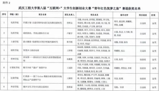 (通讯员:肖雅钰 雷翊君)为作育立异创业人才,,,,,,一连引发大学生立异创业热情,,,,,,展示立异创业效果,,,,,,立异创业学院、教务处、学生处、校团委、研究生院团结主理了武汉工程大学第八届“互联网+”大学生立异创业大赛。。。。。。。经学院推荐、校赛组委会组织专家评审,,,,,,最终评出高教主赛道金奖项目75个、银奖项目115个、铜奖项目127个;;;;;;;;“青年红色筑梦之旅”赛道金奖项目10个、银奖项目17个、铜奖项目19个;;;;;;;;工业赛道金奖项目7个、银奖项目11个、铜奖项目13个。。。。。。。我院喜获高教主赛道研究生首创组校级金奖1项、“青年红色筑梦之旅”公益赛道校级金奖、校级银奖各1项。。。。。。。