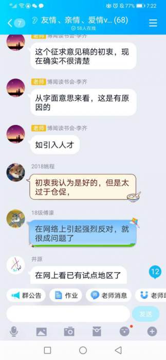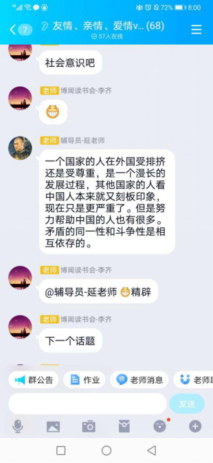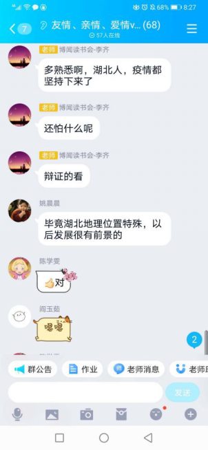 在以“友情、亲情、恋爱VS疫情”命名的QQ群中,,,,,,,,李齐先生与延飞先生向导同砚们知无不言,,,,,,,,分享自己的念书心得与感悟。。。。。。。涉及的话题从外国人永居条例到网络羁系,,,,,,,,从医患关系与疫情后湖北省就业问题,,,,,,,,短短两个多小时,,,,,,,,讲话达几千条,,,,,,,,同砚们收获满满。。。。。。。