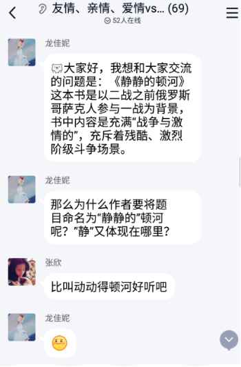 首先,,,,,,刘影同砚从“对社会动荡的反思”、“良心的准则”、“葛利高里和阿克西妮亚的恋爱”三个方面谈了《偷偷的顿河》中人性主义精神的体现。。。。。。。龙佳妮同砚从书中男主人公及他的妻子和情人这三个主要人物的下场反思差别情形下人性的演变,,,,,,她提出人性不是简单的,,,,,,而是重大的,,,,,,体现在现实生涯中,,,,,,从人们对事务的反应上会体现出来。。。。。。。