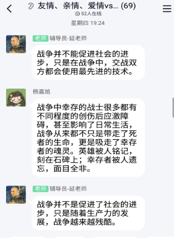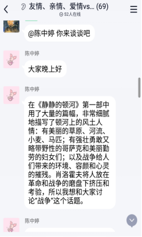随后,,,,,,刘娉同砚从宏观上分享了独到看法,,,,,,她提出作者从悲剧中找寻人物的人格魅力,,,,,,提醒我们思索问题应该从全方位、多条理去看待问题,,,,,,突破一直常有的牢靠头脑。。。。。。。李文丹同砚重新的视角,,,,,,将本书主人公与《在世》主人公比照,,,,,,她提出对灾祸的生涯要有坚韧的性格,,,,,,面临无情和残酷的现实,,,,,,都要顽强的活下去。。。。。。。陈中婷同砚捉住书中时间线索,,,,,,从景物和人物的细节形貌剖析了战争前后的巨变。。。。。。。