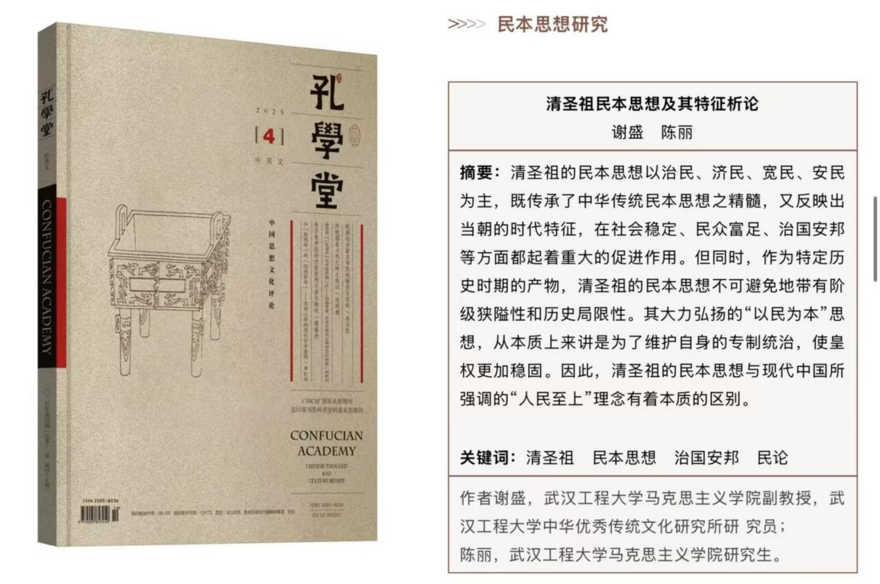 本网讯(通讯员 张晓 宋嘉怡)克日,,,,,,,我院谢盛副教授、硕士研究生陈丽在《孔学堂》(CSSCI扩展版期刊)揭晓论文《清圣祖民本头脑及其特征析论》。。。。。。。。