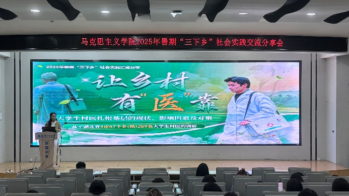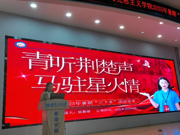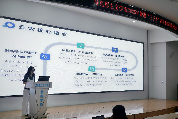 分享会第一阶段以“实践效果交流”为焦点,,,,,,五支暑期“三下乡”实践团代表依次上台讲话,,,,,,用鲜活案例与生动细节,,,,,,展现马院学子在实践中的继续与生长。。。。。